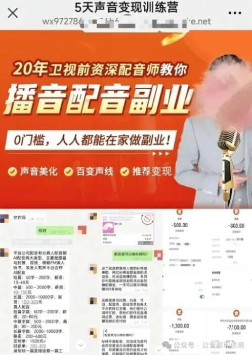 诈骗分子会在社交平台以及网络直播间中,发布投资理财课程、无门槛兼职、高薪赴境外工作等内容的视频。在获得受害人关注后,诈骗分子会在评论区或者直播弹幕中发布“想了解更多,私信联系客服”等评论,引诱受害人越过官方平台加入所谓的“投资指导群”“配音群”“兼职群”“课程群”,进而实施诈骗。