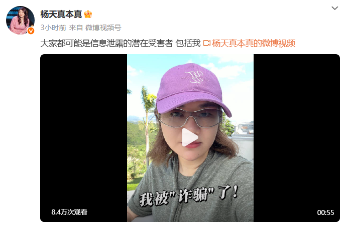24日,杨天真在个人社交平台发布视频分享自己遭遇诈骗的过程,并提醒网友们要注意安全。